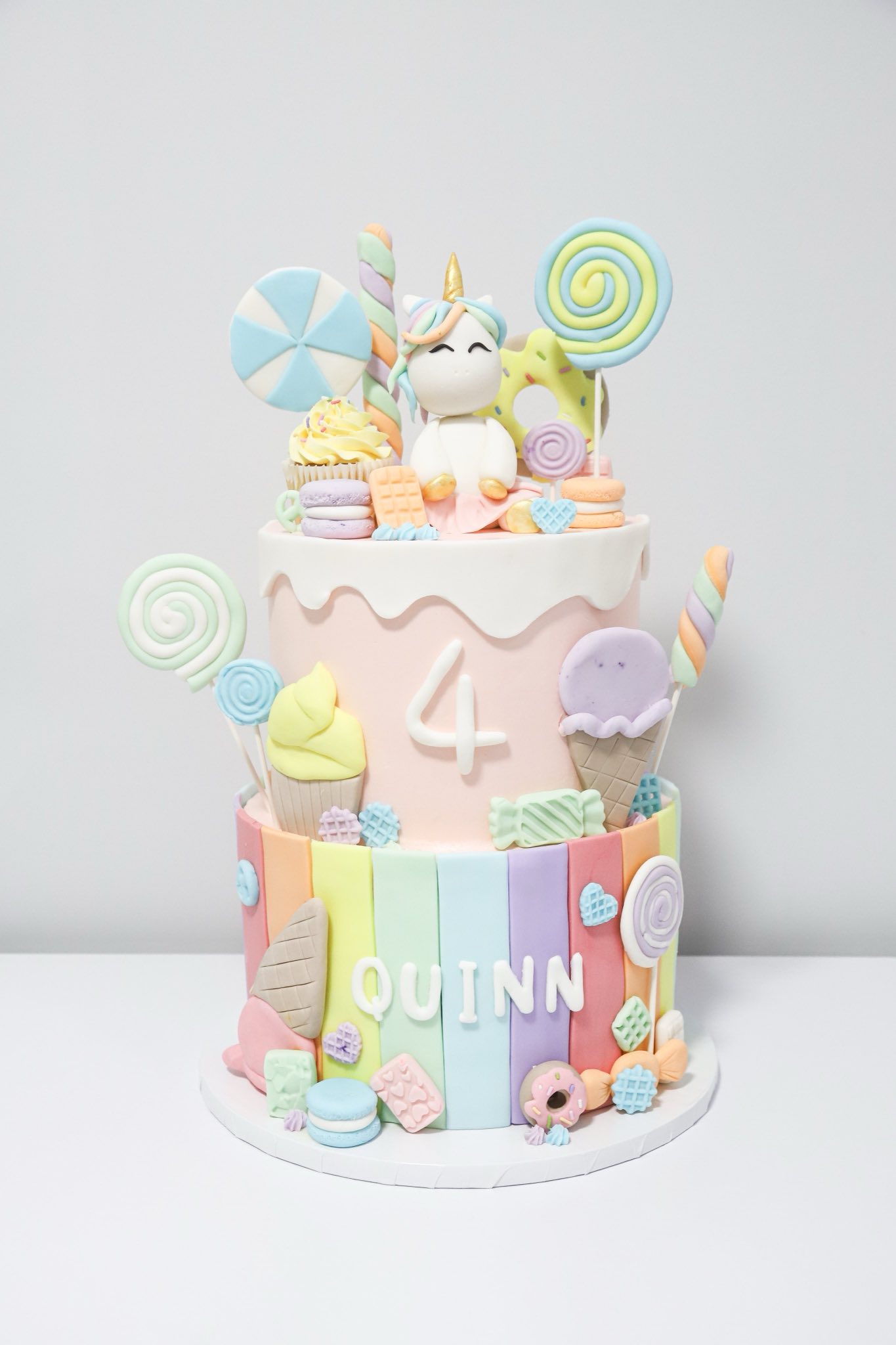 A dreamy two-tier masterpiece where pastel-pink clouds of vanilla buttercream meet a cascade of handcrafted candy illusions. Golden-horned unicorn, swirled lollipops, macarons, and tiny ice-cream cones appear to float atop a rainbow-striped candy-barrel base, finished with the name “QUINN” in elegant white chocolate lettering. Perfect for little dreamers turning four and anyone who still believes in edible magic.