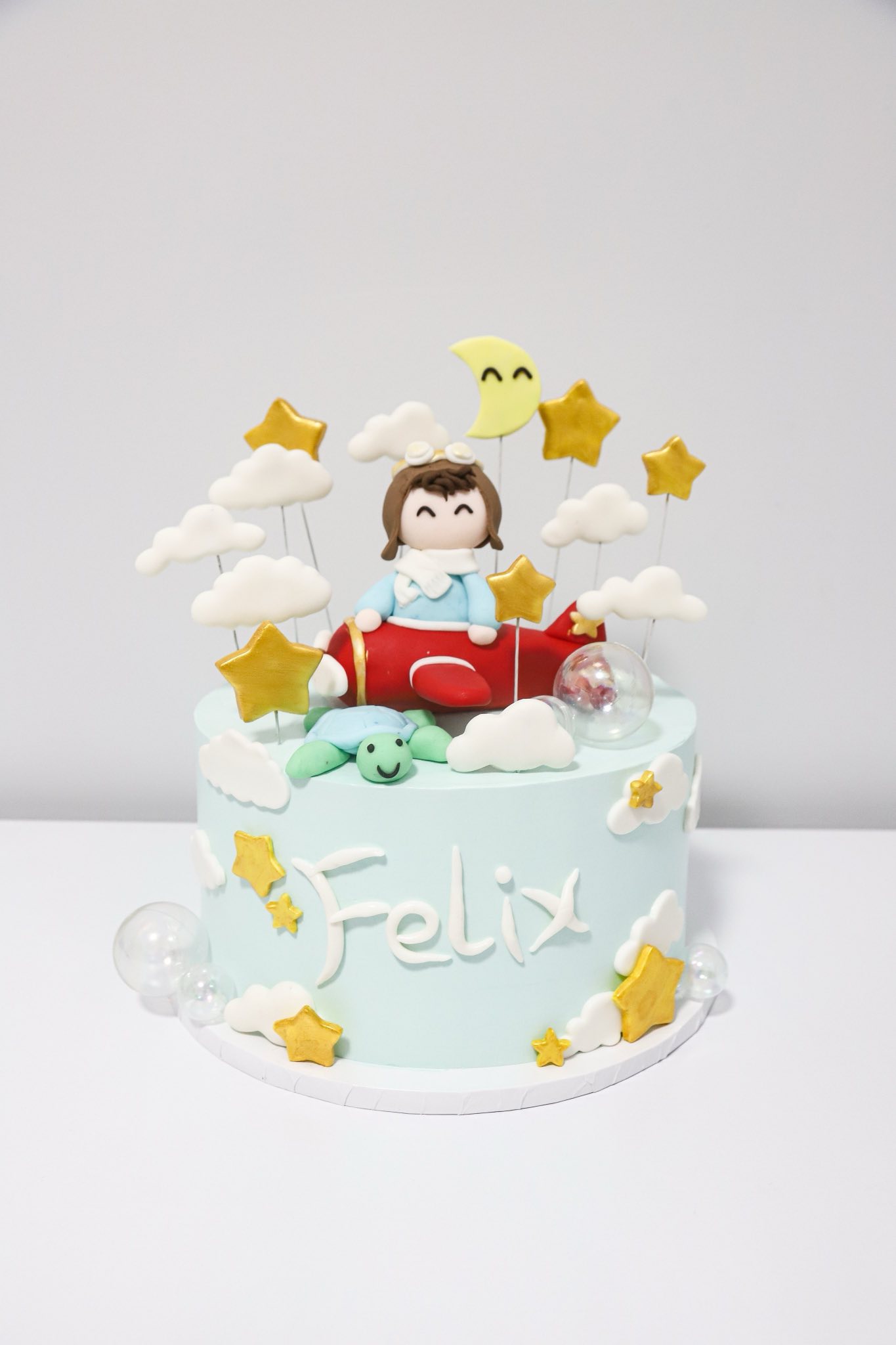A whimsical tribute to young explorers, this soft blue cake showcases a smiling little pilot in his vibrant red plane, surrounded by fluffy clouds, radiant golden stars, and a contented crescent moon. Sparkling edible bubbles drift playfully around the base, adding an extra layer of enchantment. Bearing the name “Felix” in elegant script, this creation turns every slice into a ticket to a starlit sky adventure.