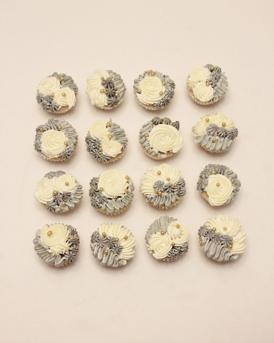 invites you to take a bite. Each cupcake is adorned with delicate pearl decorations, adding a touch