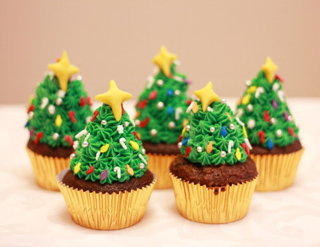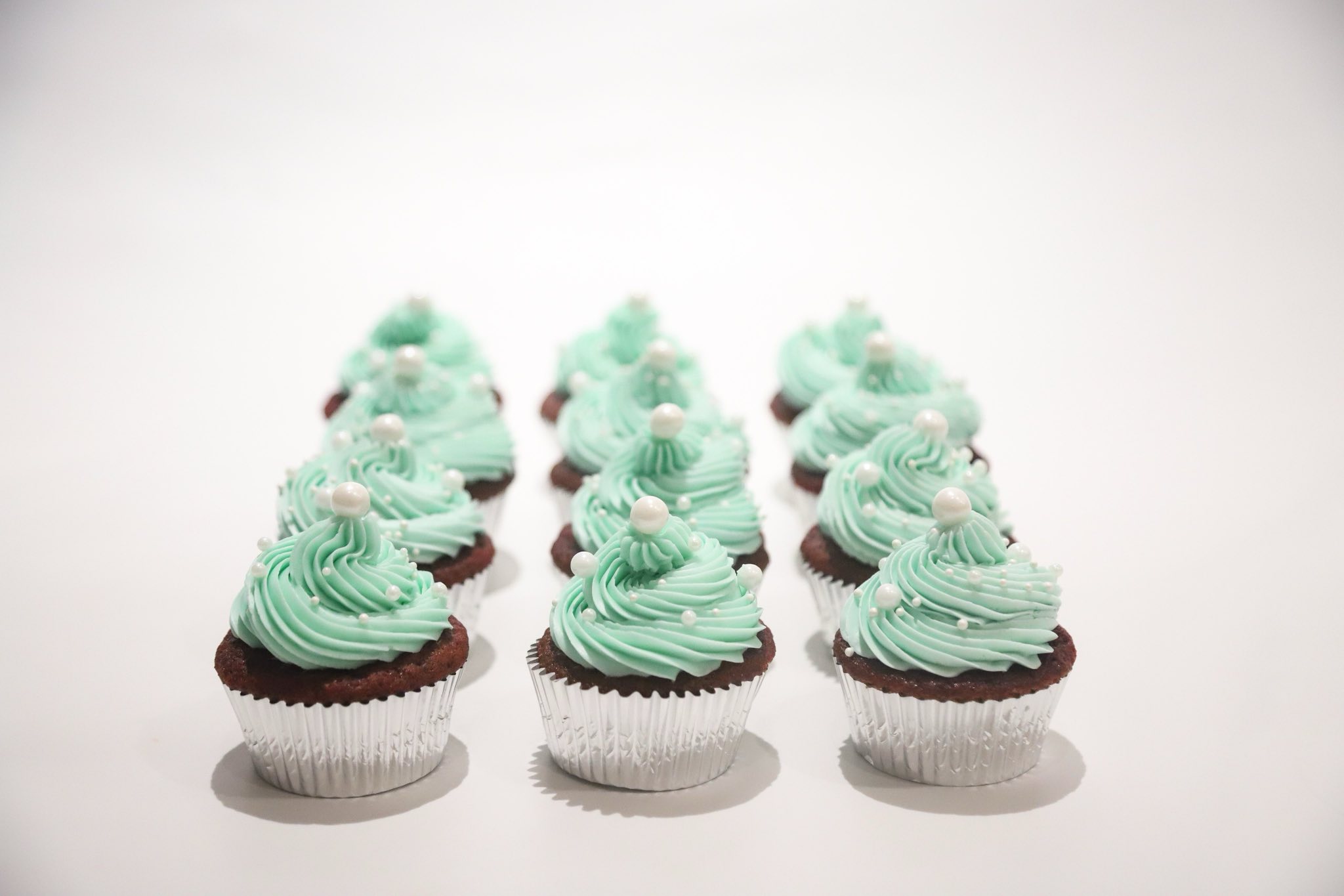 Christmas trees. Each cupcake features rich chocolate flavor and vibrant green frosting, adorned
