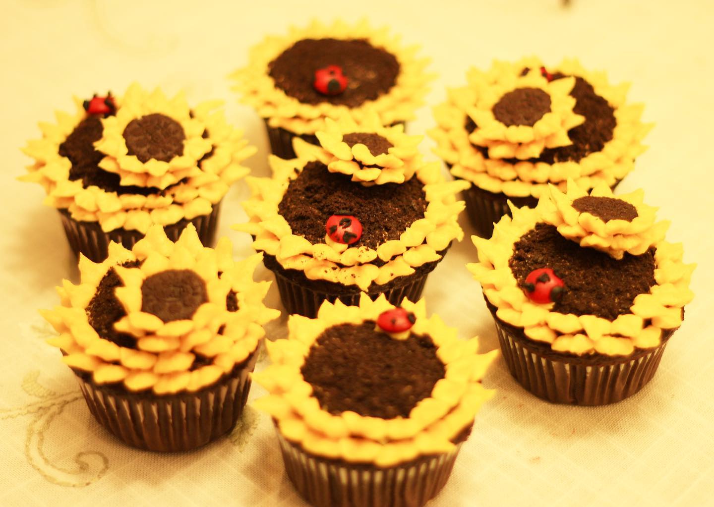 These charming cupcakes are topped with vibrant, sunflower-inspired frosting, creating a delightful