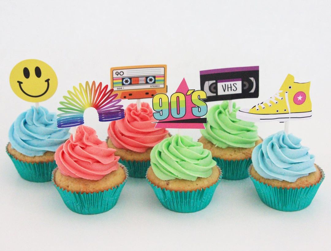 toppers inspired by the iconic 90s. Each cupcake is topped with a swirl of fluffy frosting,